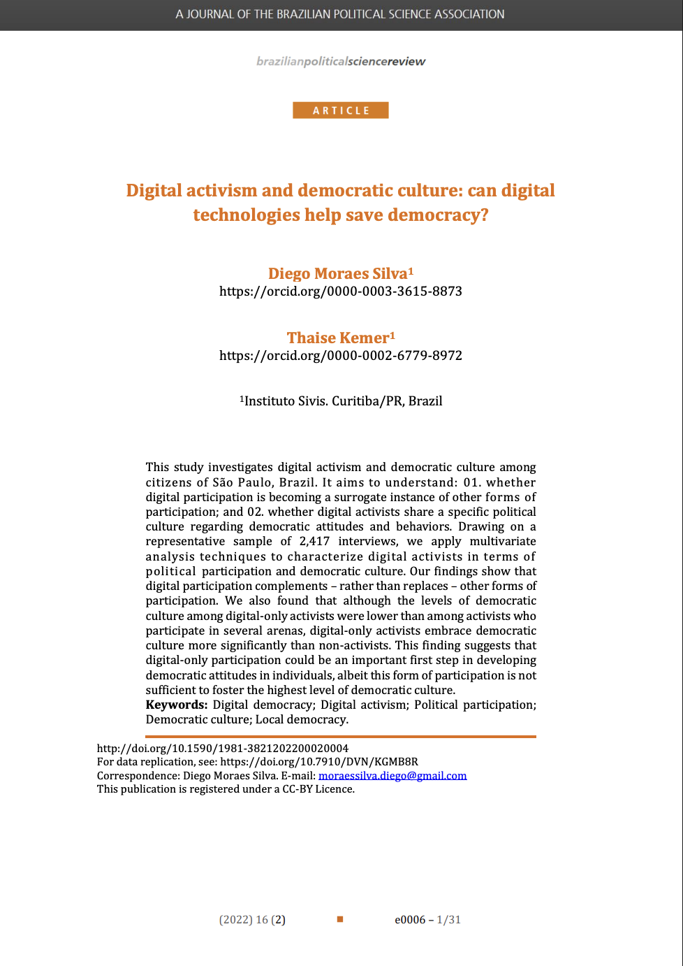 Artigo que examina o ativismo digital e a cultura democrática entre os cidadãos de São Paulo, e como a participação digital ajuda a formar atitudes democráticas, mas sozinha não cria uma cultura democrática forte.