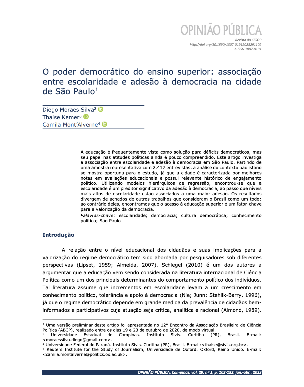 Estudo que mostra a associação entre escolaridade e adesão à democracia na cidade de São Paulo, destacando o papel da educação na cultura política democrática.