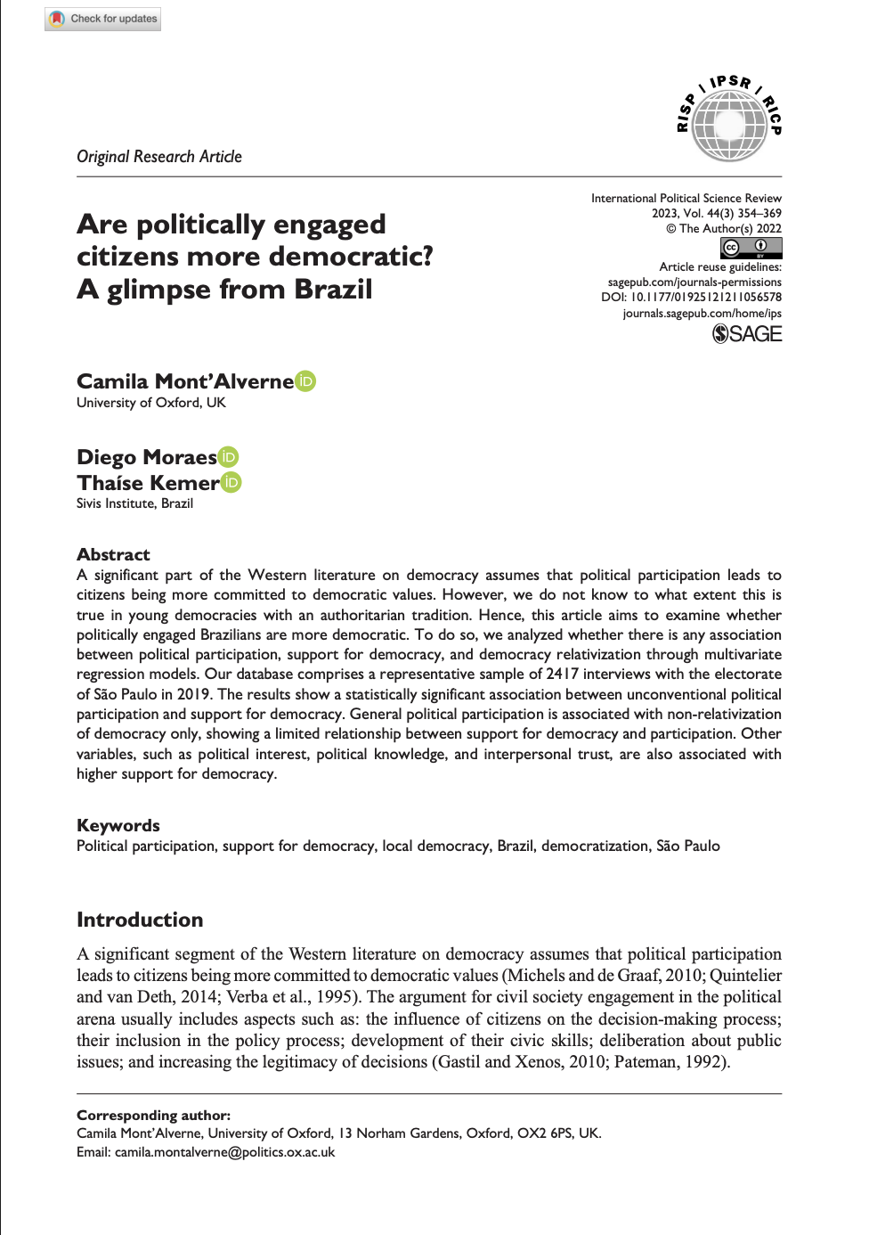Artigo que investiga se cidadãos politicamente engajados no Brasil são mais democráticos e mostra que a participação está ligada à maior apoio, mas de forma limitada.